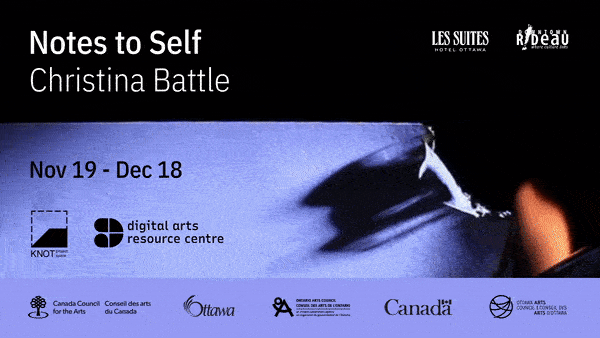 The Digital Arts Resource Centre’s Knot Project Space is thrilled to invite you to Christina Battle’s Notes to Self. A few selections of her Notes will be projected onto Les Suites Hotel in front of Artscourt (2 Daly Ave), on Thursdays, Fridays and Saturdays from November 19th to December 18th (5-8pm).